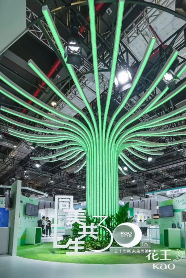 本屆進(jìn)博會(huì)上,花王向世界展示“同美共生”的美好愿景,并在現(xiàn)場(chǎng)展館的搭建上別具新意,打造了象征世界萬(wàn)物和諧和持久生命力的“同美共生之樹”,全方位、多角度、立體化展示花王基于ESG視點(diǎn)不斷展開的實(shí)踐活動(dòng)。在展區(qū)設(shè)置上,圍繞“同美共生”愿景體系下三大重點(diǎn)領(lǐng)域——“和美自然”、“予美生活”、“創(chuàng)美未來(lái)”,分別呈現(xiàn)花王在多領(lǐng)域持續(xù)推進(jìn)的創(chuàng)新舉措,為觀眾帶來(lái)充滿科技感與前瞻性的創(chuàng)新盛宴。