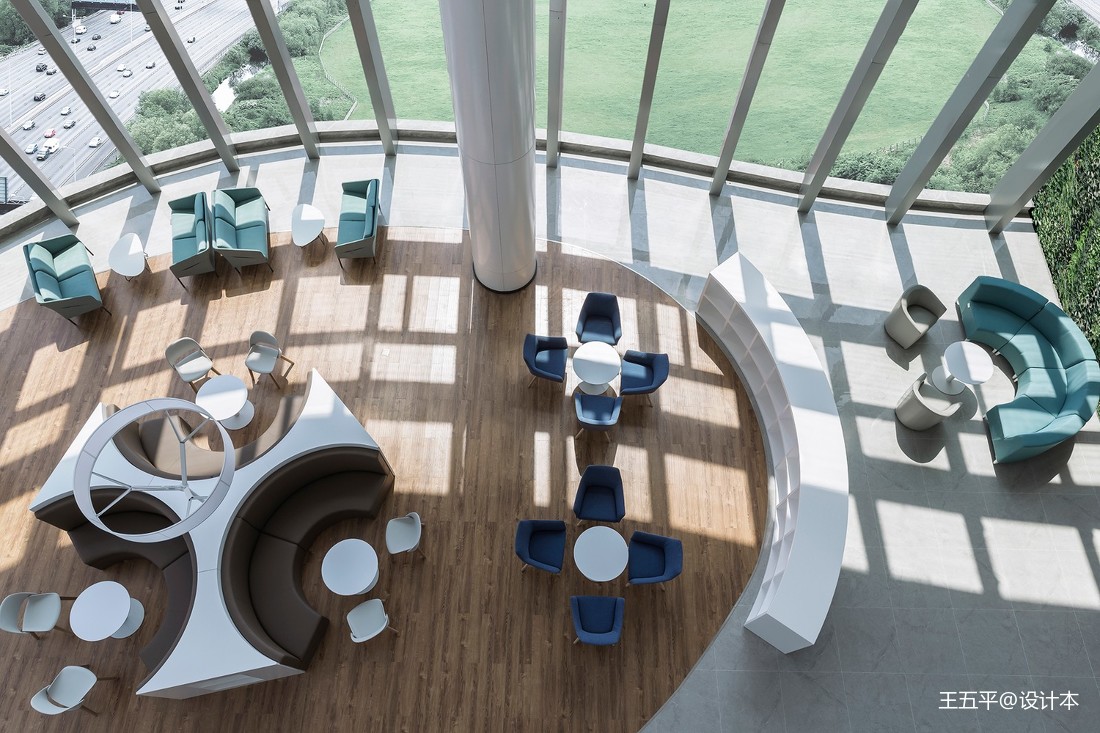 本項目盤踞于南寧市五象新區,恢弘大氣。室內辦公大堂則延續了建筑風格,糅合了科技與藝術的理念,以創新的手法抒寫現代化辦公國際風貌。中空大堂的室內有三層之高,四周柱子撐起了豪邁的空間風骨,設計以白色為主色,搭配以綠、藍、褐,藉由造型和色彩的純粹性,帶來無與倫比的審美享受。